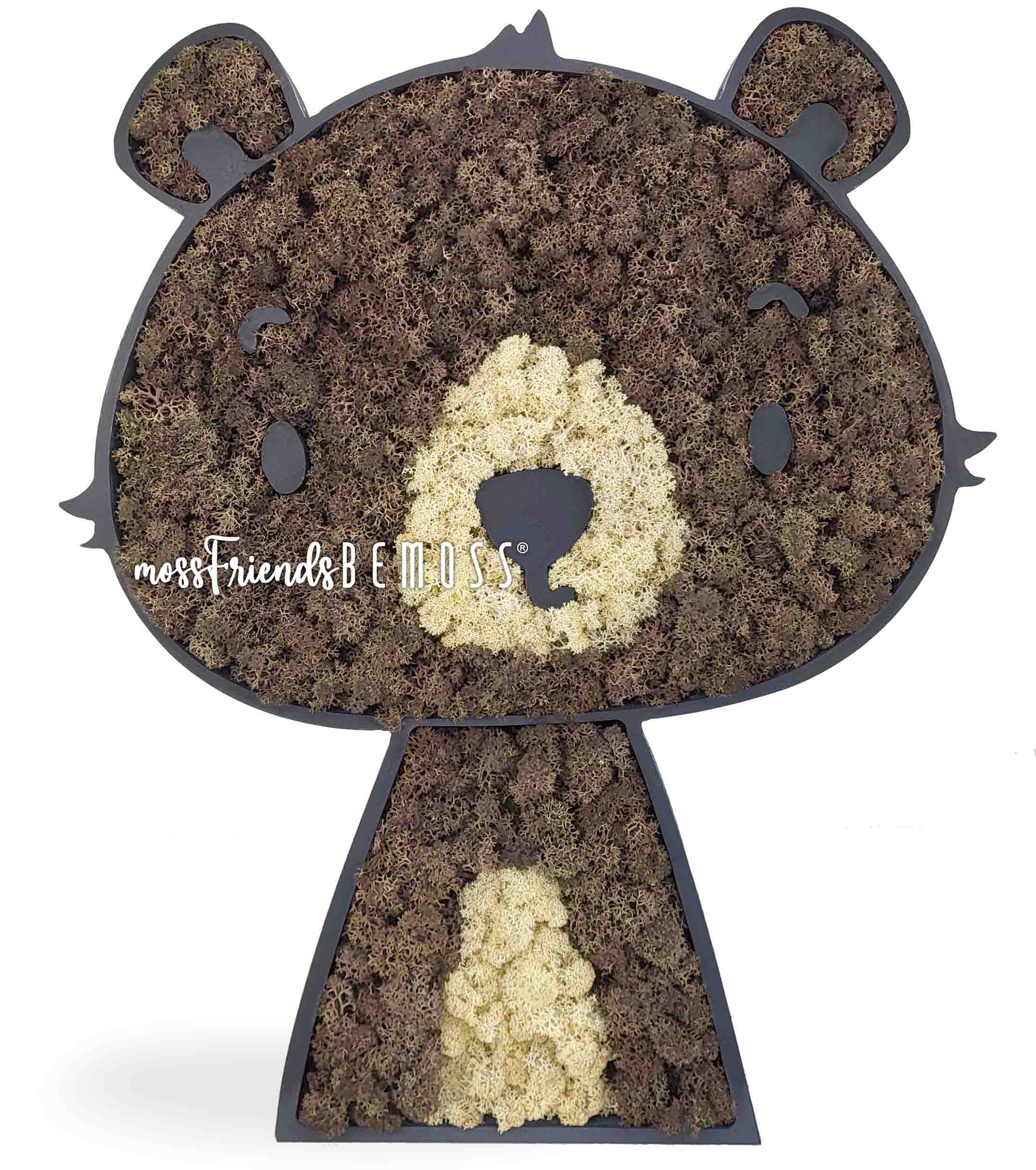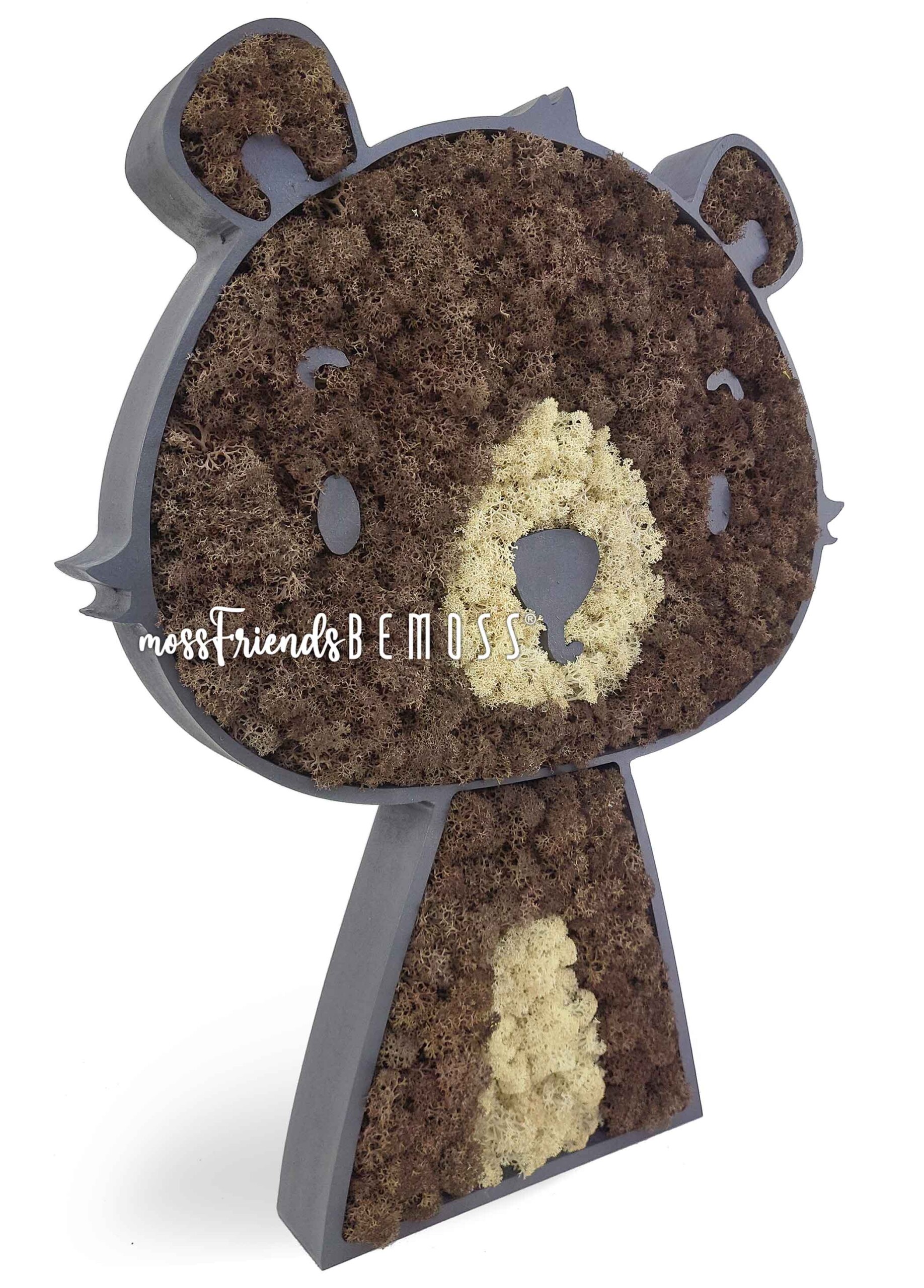 Moss Vrienden door BEMOSS® is een limited edition collectie van prachtige mosdieren, elk met liefde met de hand gemaakt van mos uit de bossen van Noorwegen. Onze Moss Vrienden zullen mooie metgezellen zijn voor de slaapkamers van uw kinderen. Elke kleine jongen of meisje zal hier zijn of haar favoriete mosmaatje vinden, waarmee ze hun kinderkamer kunnen verfraaien. Vergeet niet… Mosvrienden zijn niet graag alleen, dus ze zijn altijd het beste samen met andere mosvrienden. Creëer samen uw groep om een glimlach op uw gezicht te toveren. Mosdieren kunnen als schilderij aan de muur worden bevestigd of u kunt ze op een plank of een andere plek zetten waar ze een mooi uitzicht hebben.
