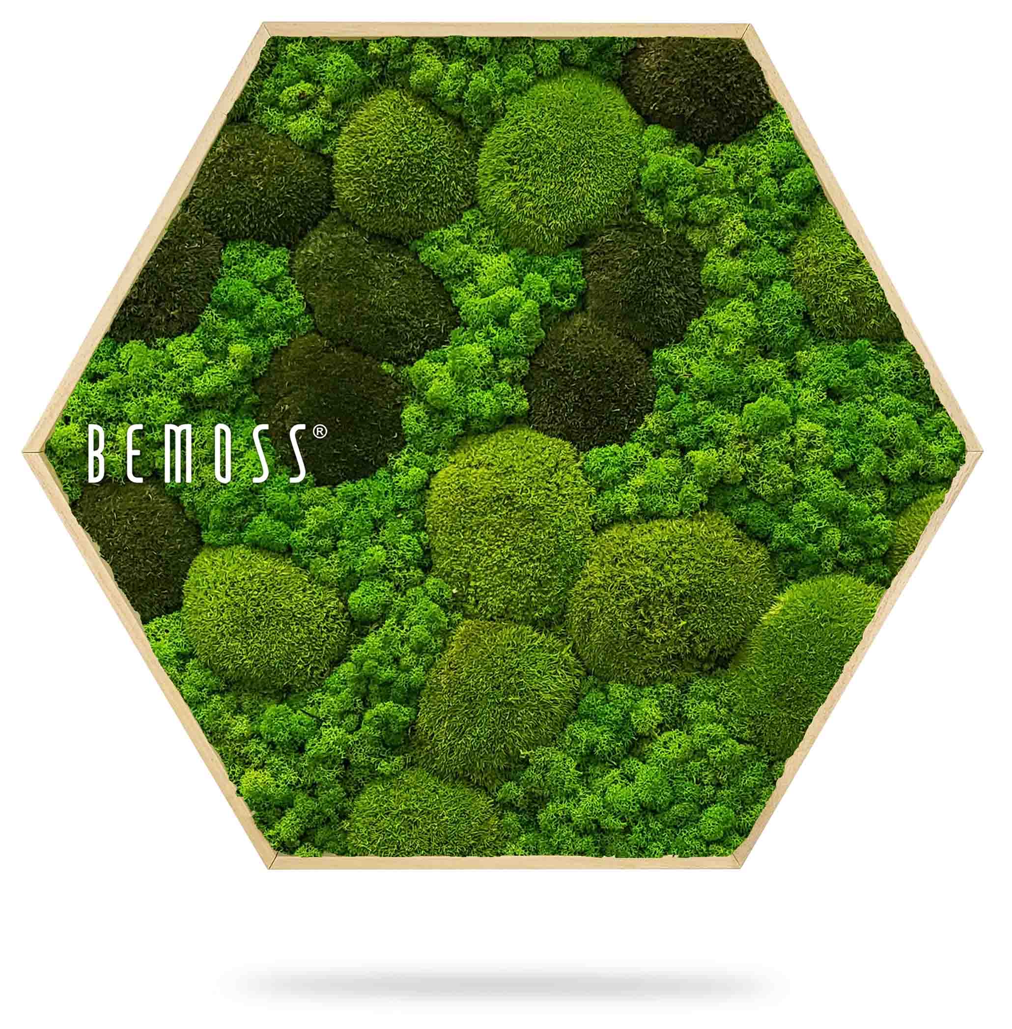 Voor het HEXAGON BEMOSS® ORTHO mosschilderij kunt u kiezen uit verschillende soorten houten lijsten.