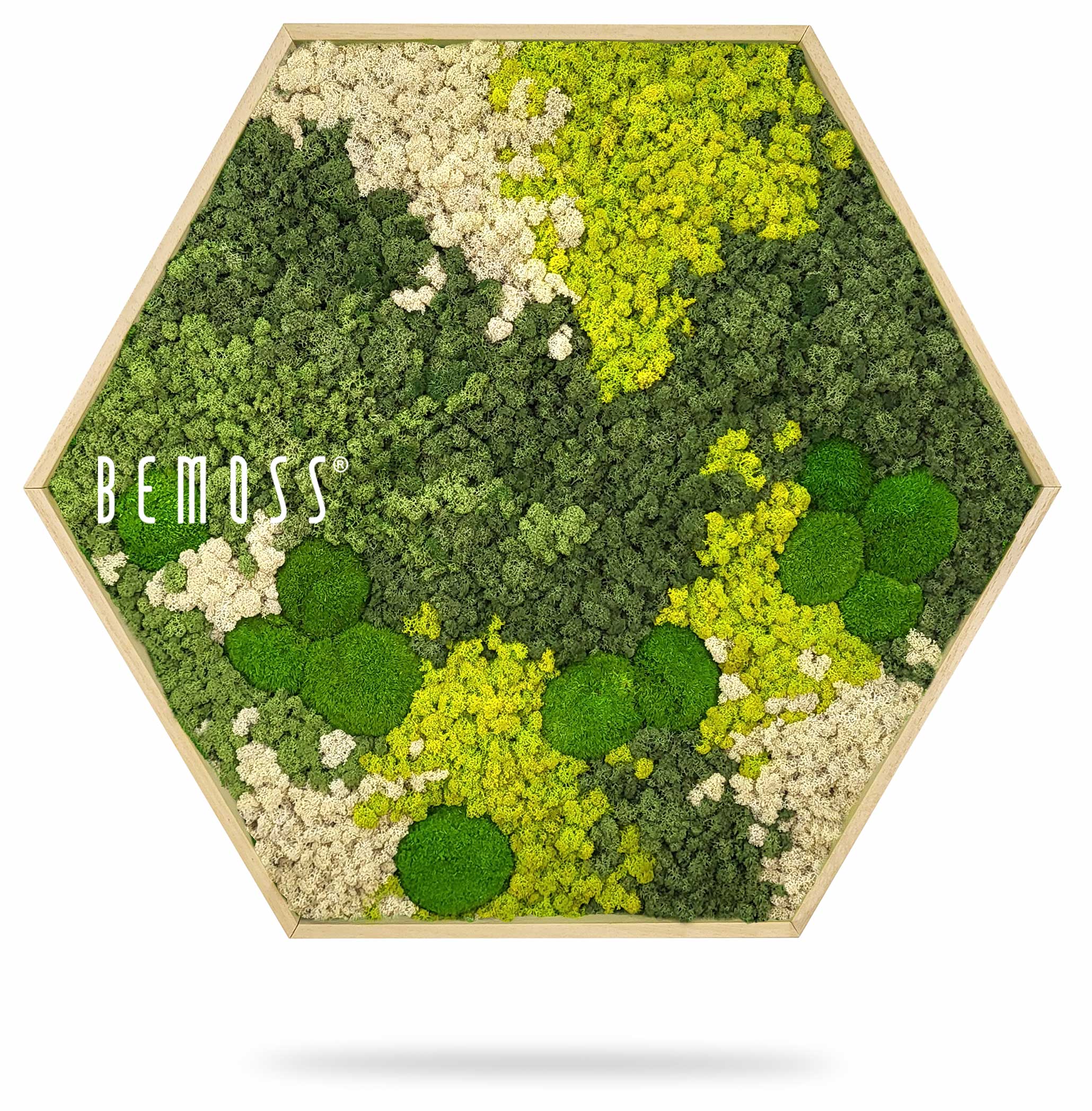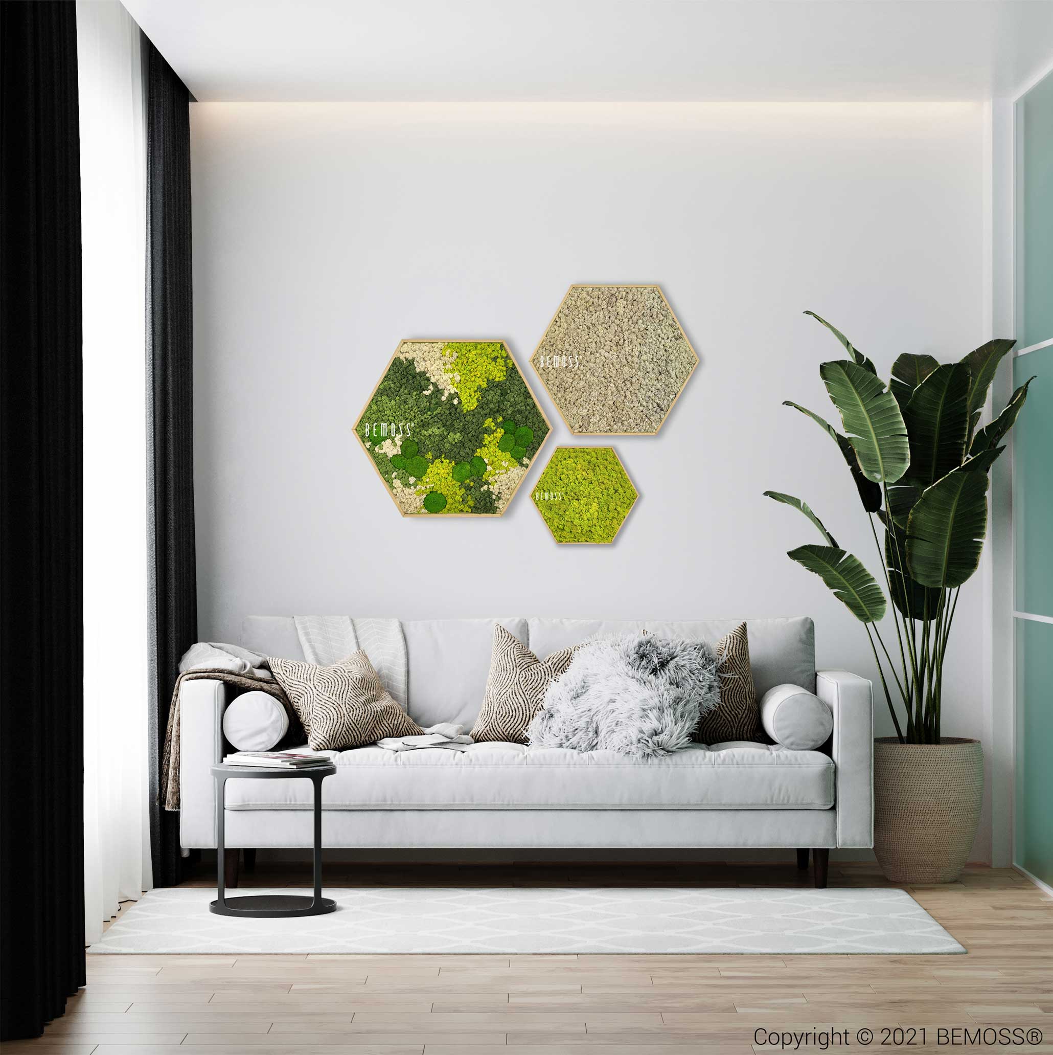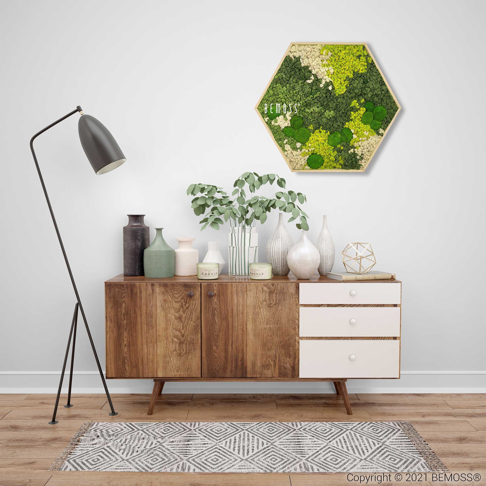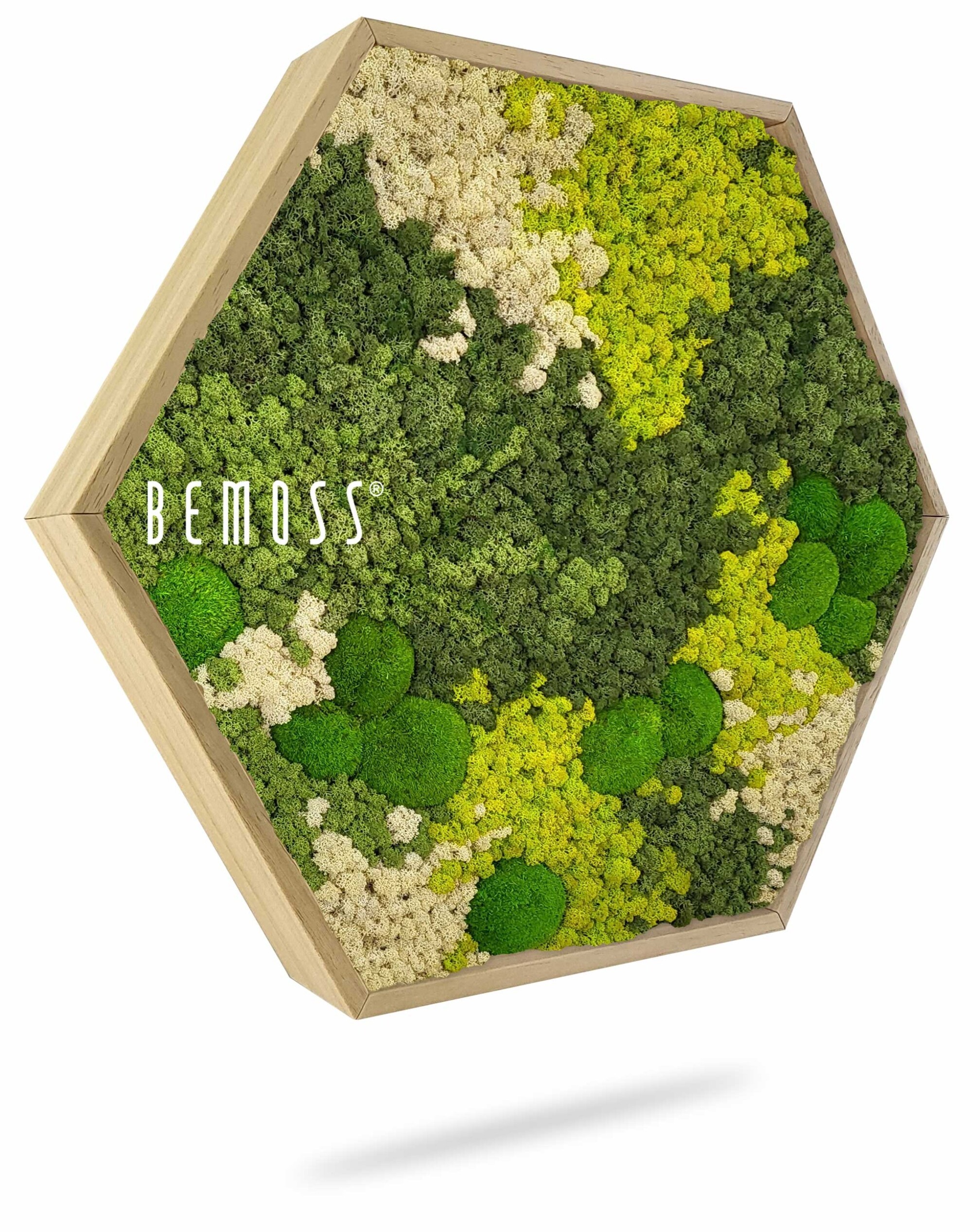 Voor het HEXAGON BEMOSS® ORTHO mosschilderij kunt u kiezen uit verschillende soorten houten lijsten.