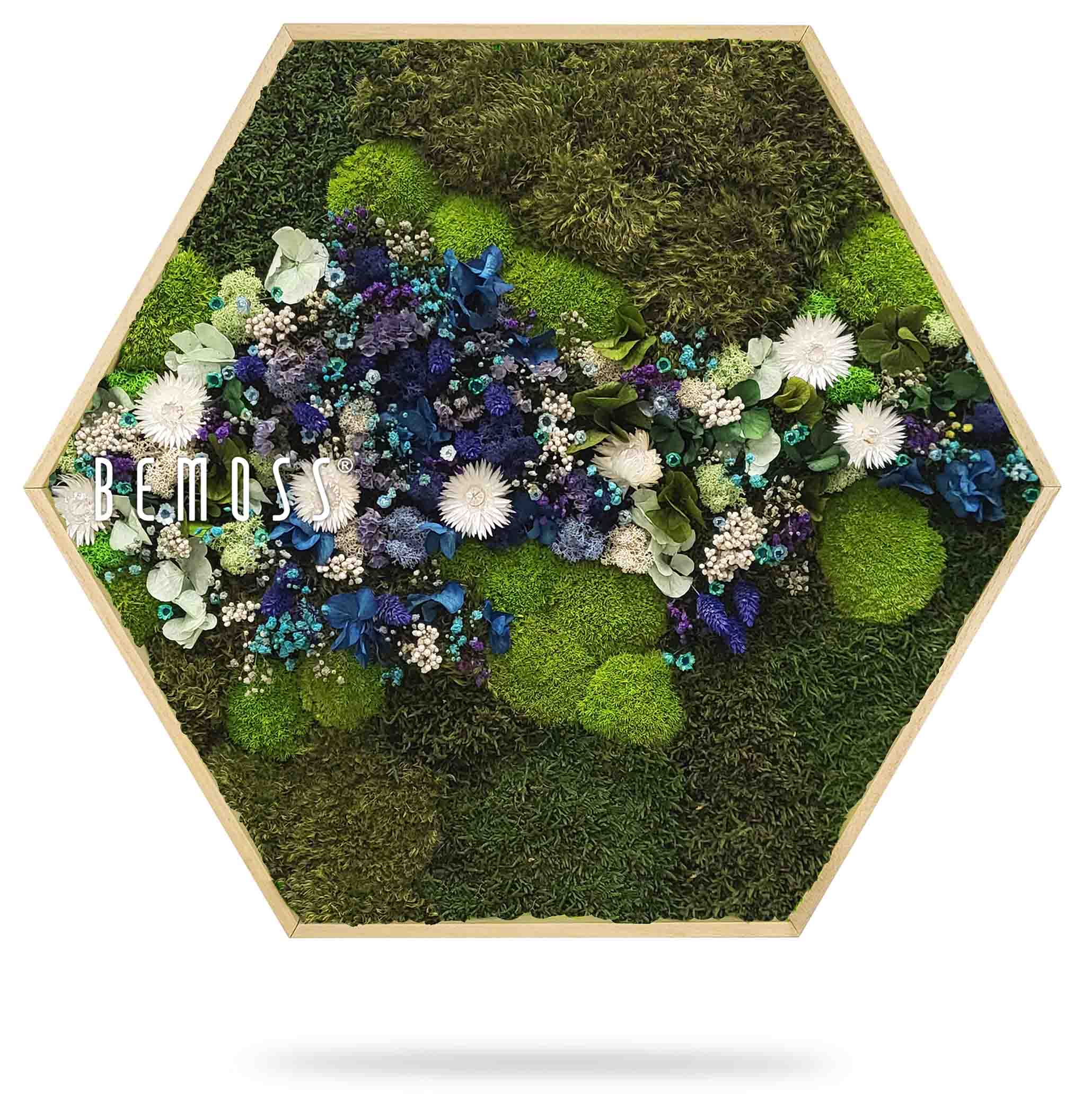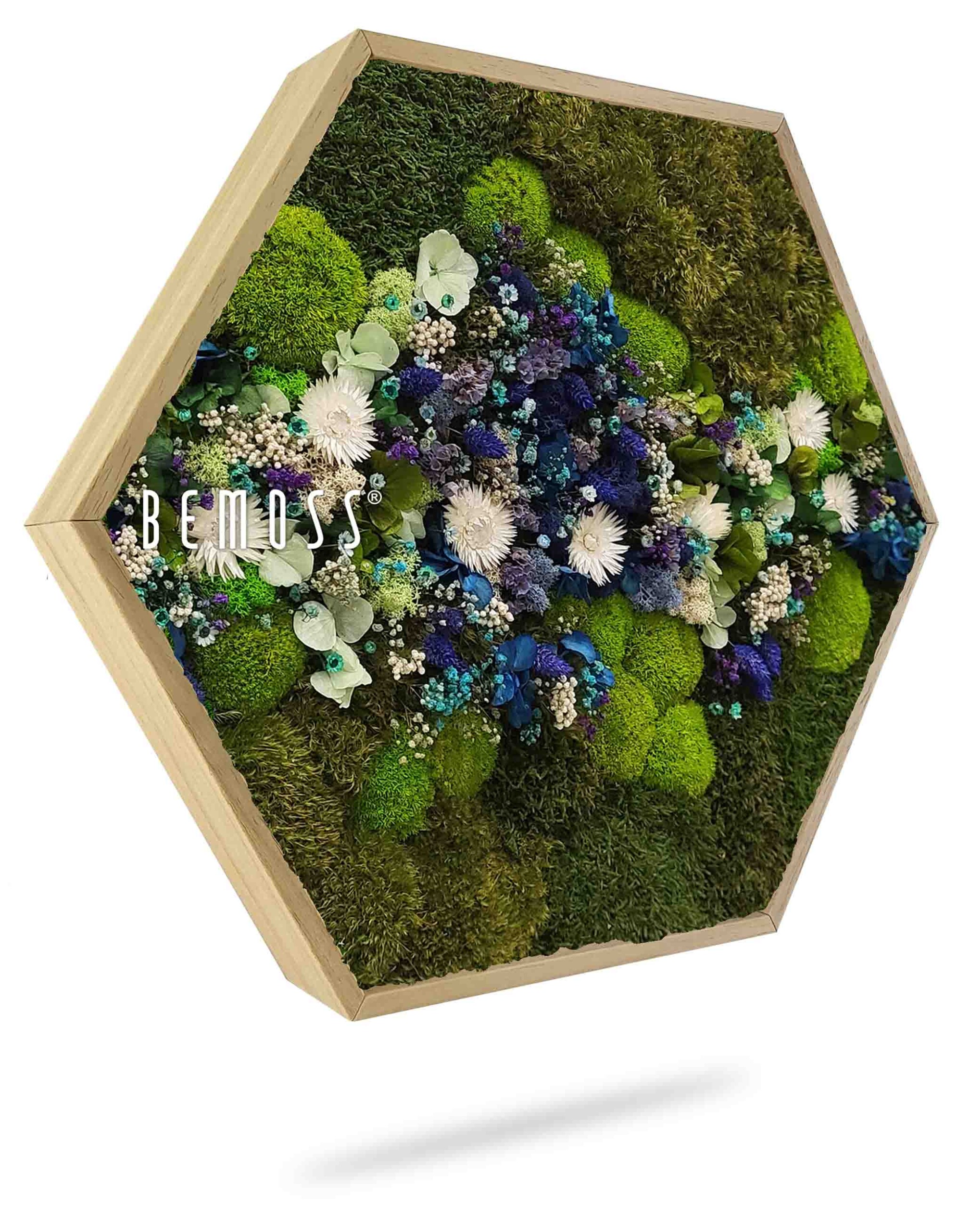 Voor het HEXAGON PLANTEN mosschilderij kunt u kiezen uit verschillende soorten houten lijsten.