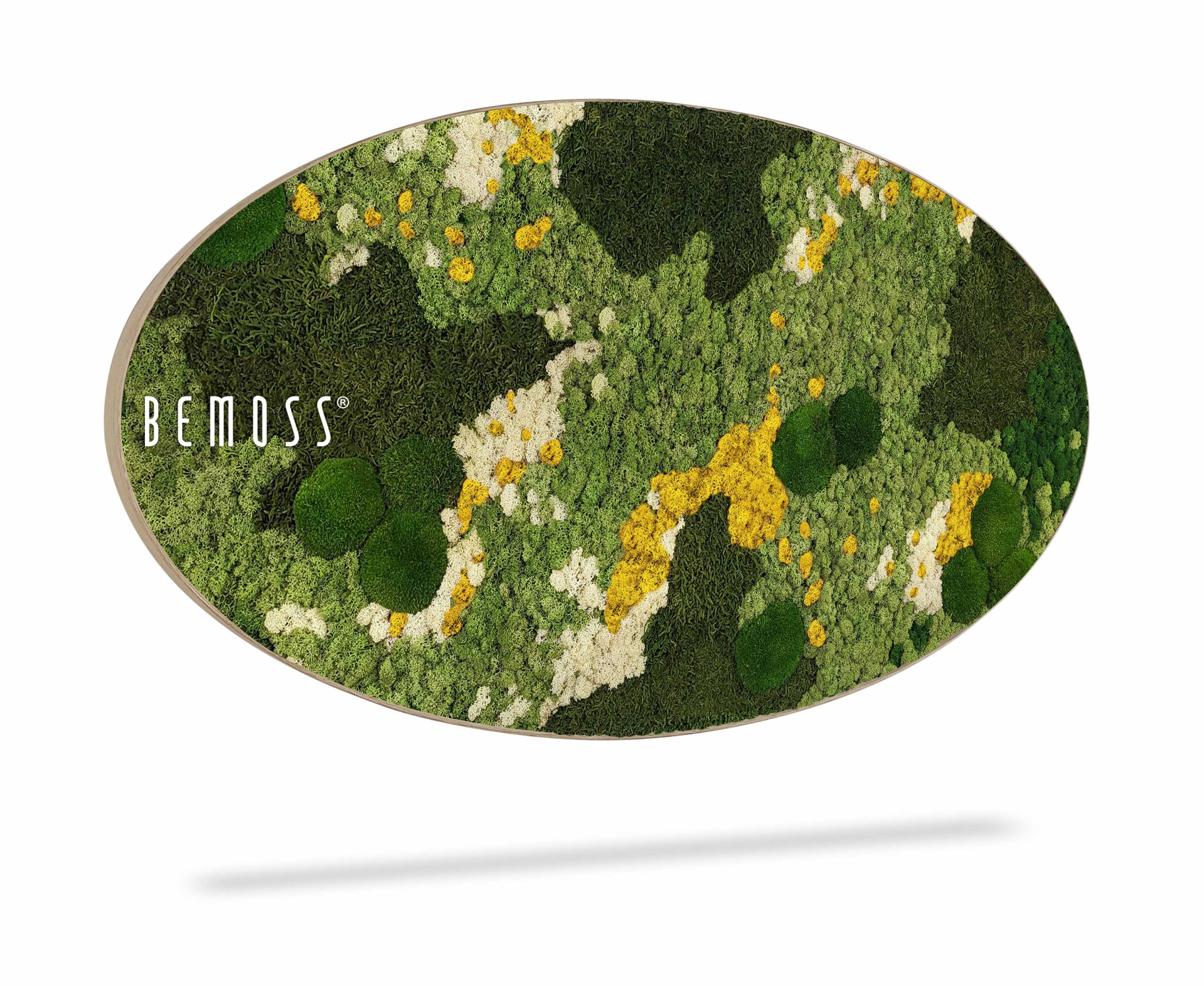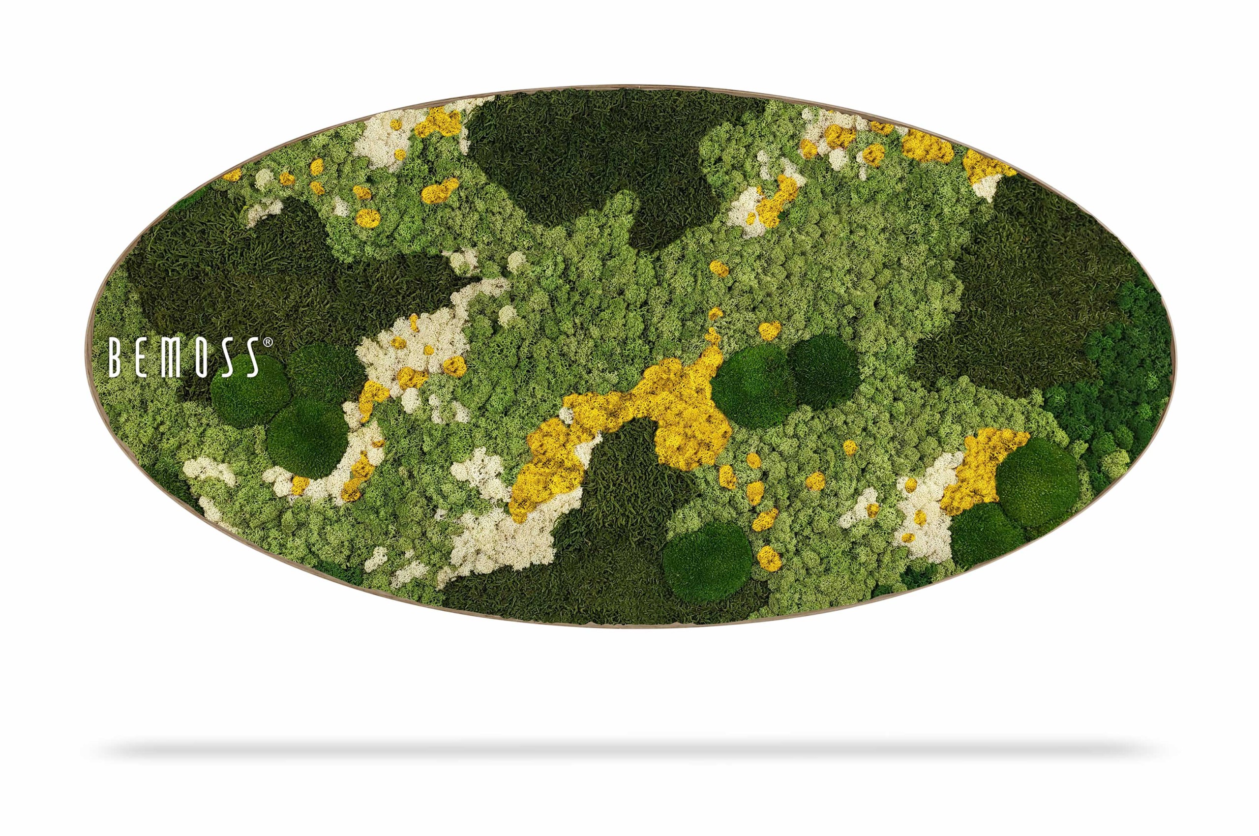 De BEMOSS® ORTHO mosschilderij kan in verschillende houten lijsten gekozen worden. De afbeelding is slechts een illustratief beeld van het product, het toont een ellips met afmetingen 50x100cm. Er worden getypte formaten geproduceerd, maar het is natuurlijk mogelijk om een schilderij van elk formaat volgens uw wensen te vervaardigen. Schrijf ons gewoon op eshop@bemossnl.nl