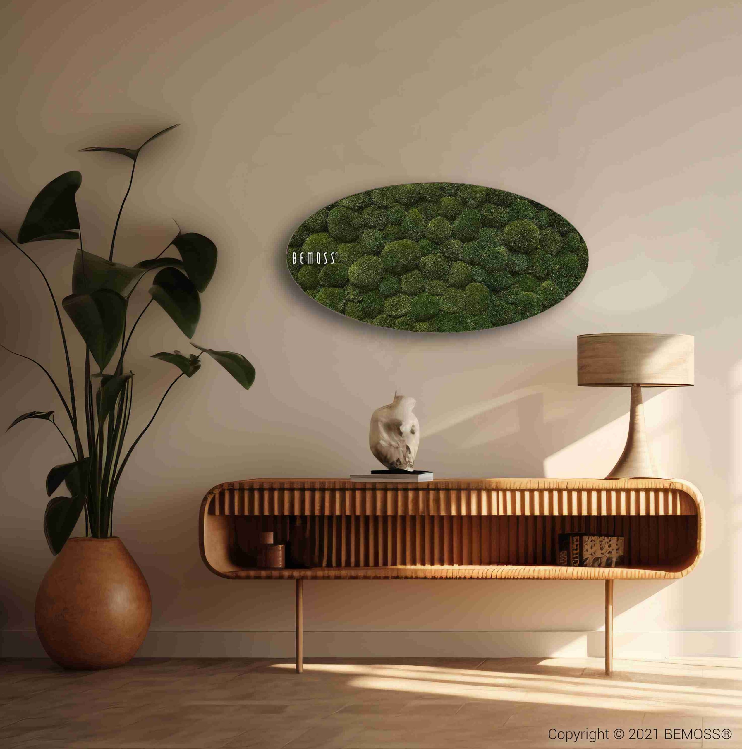 De BOLMOSS mosschilderij kan in verschillende houten lijsten gekozen worden. De afbeelding is slechts een illustratief beeld van het product, het toont een ellips met afmetingen 50x100cm. Er worden getypte formaten geproduceerd, maar het is natuurlijk mogelijk om een schilderij van elk formaat volgens uw wensen te vervaardigen. Schrijf ons gewoon op eshop@bemossnl.nl